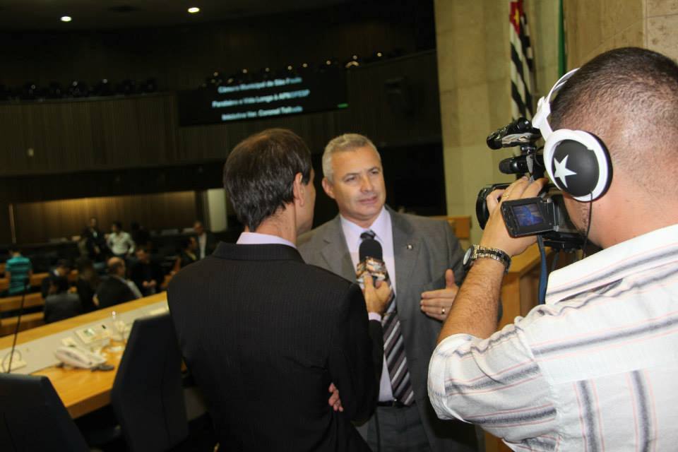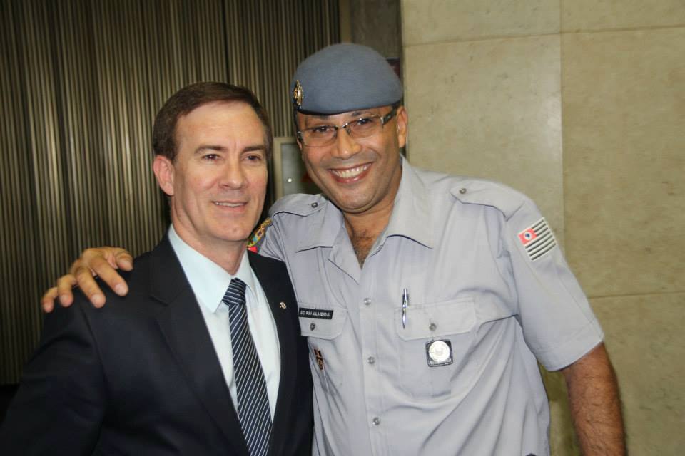 Me acompanhando na cerimônia estavam os vereadores Coronel Camilo e Conte Lopes; o deputado federal Arnaldo Faria de Sá; a senhora Marianne Pinotti, Secretaria da Pessoa com Deficiência e Mobilidade Reduzida; o doutor Antônio Ferreira Pinto, ex-secretário de Segurança Pública de São Paulo; e a Coronel Maria Yamamoto, do Centro de Comunicação Social da Policia Militar do Estado de São Paulo.